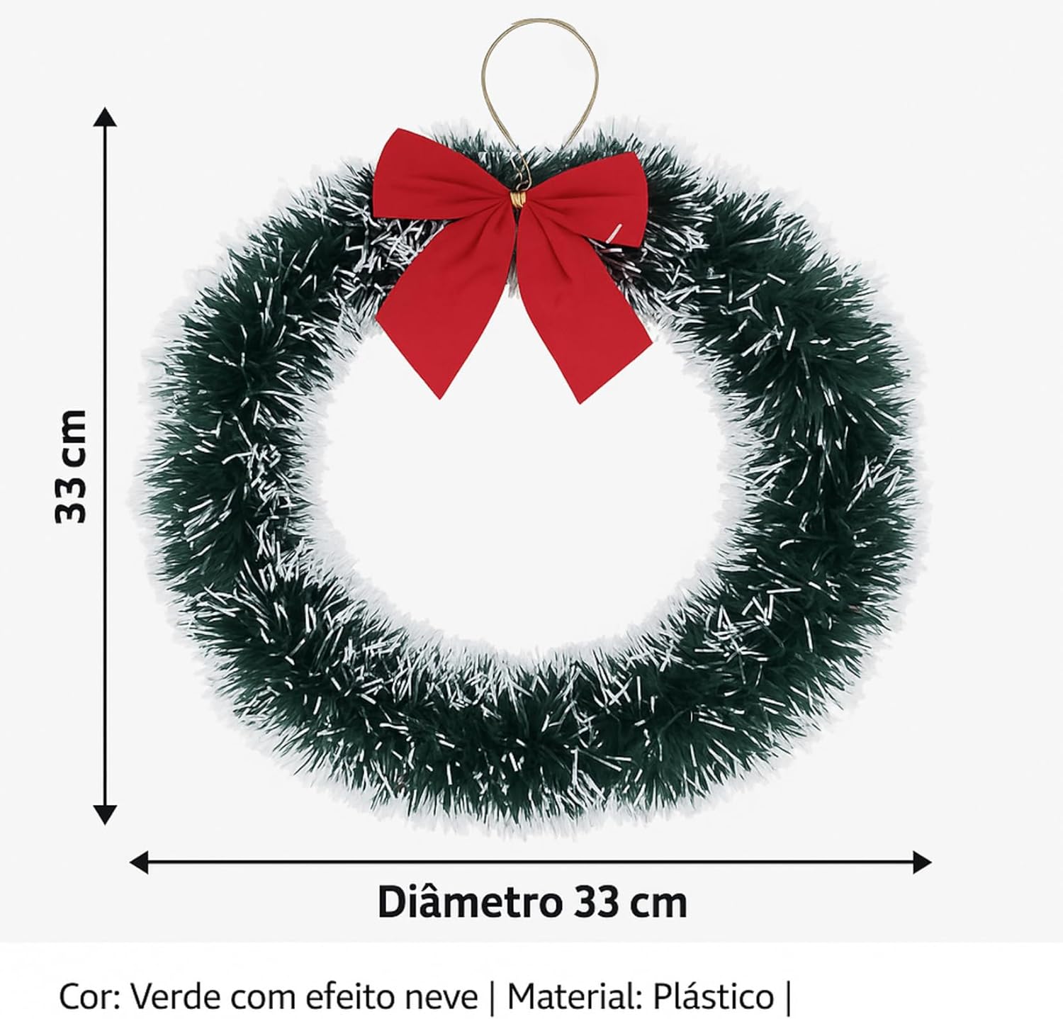 Guirlanda de Natal Nevada 33 cm com Laço Vermelho – Festão Verde de Plástico para Porta ou Parede, Decoração Natalina Reutilizável – Lene